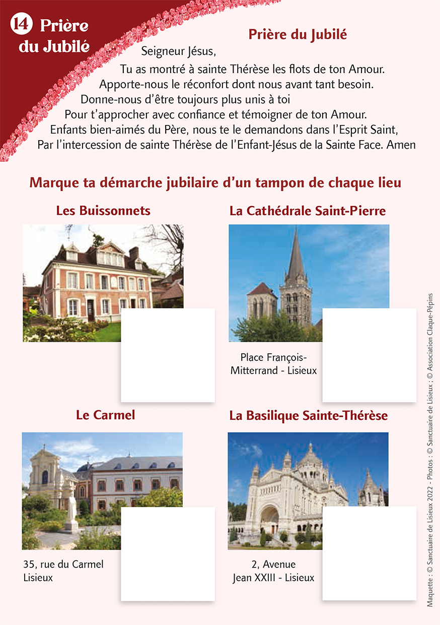 - 15h30 : Ouverture de la Porte Sainte par Monseigneur Habert, Evêque de Bayeux et Lisieux. Démarche jubilaire sur les lieux thérésiens (Basilique, Évocation Buissonnets, Cathédrale, Carmel)